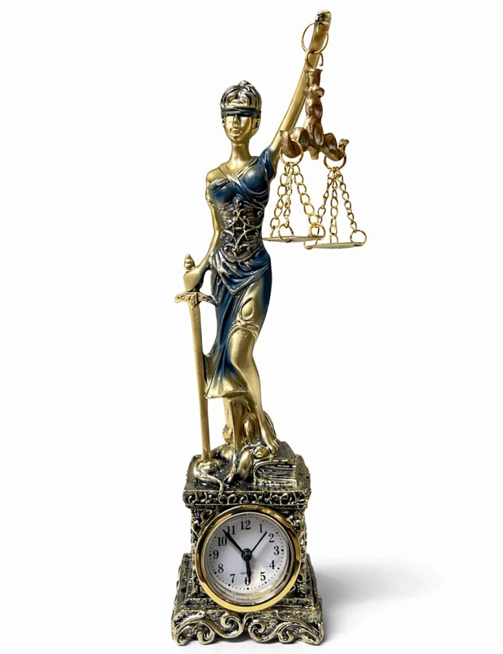26X7 CM POLYESTER SAATLİ ADALET FİGÜRÜ Ürün ÖzellikleriPolyester Saatli Adalet Figürü, klasik adalet sembolünü dekoratif saat tasarımı ile birleştiren şık ve dikkat çekici bir masa aksesuarıdır. 26x7 cm ölçüsündeki uzun ve zarif formu sayesinde ofis masası, kitaplık ve danışma alanlarında estetik bir görünüm sunar. Üst bölümde yer alan terazi tutan adalet figürü detayı ile güçlü bir adalet sembolü vurgusu oluştururken, alt kısmında bulunan saat bölümü ürüne işlevsellik kazandırır. Hem dekoratif hem kullanışlı yapısıyla masa üstünde prestijli bir duruş sergiler. Dayanıklı polyester malzeme yapısı sayesinde uzun ömürlü kullanım sunar. Hukuk büroları, avukat ofisleri ve kurumsal çalışma alanları için anlamlı bir ofis dekor ürünü ve hediye alternatifi olarak tercih edilebilir.Ürün Teknik Özellikleri Özellik Açıklama Ürün Adı Polyester Saatli Adalet Figürü 26x7 Cm Malzeme Polyester Ölçü 26 x 7 cm Tasarım Adalet figürü ve entegre masa saati Kullanım Alanı Ofis, hukuk bürosu, masa üstü dekorasyon Paket İçeriği1 adet Polyester Saatli Adalet Figürü (26x7 cm)