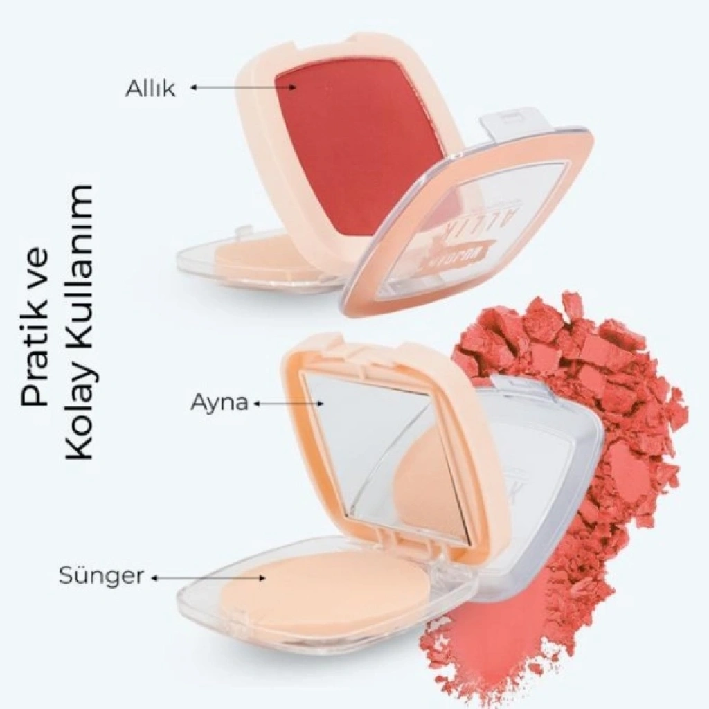 4'ÜLÜ AYNALI ALLIK SETİÜrün Özellikleri4’lü aynalı allık seti, makyaj rutininde pratiklik ve renk çeşitliliğini bir arada isteyenler için hazırlanmıştır. Set içerisinde yer alan 4 farklı ton, günlük makyajdan daha belirgin uygulamalara kadar farklı stiller oluşturmayı kolaylaştırır. Tonlar arasında geçiş yapabilme imkânı, makyaj görünümünü ortama ve tercihe göre uyarlamayı sağlar. Her bir allığın içerisinde bulunan ayna ve sünger, makyajı dışarıda, seyahatte veya gün içinde tazelemek isteyen kullanıcılar için kullanım kolaylığı sunar. Kompakt yapısı sayesinde çantada taşımaya uygun olan bu set, renk çeşitliliği ve pratik kullanım detaylarıyla makyaj çantasında düzenli ve işlevsel bir alan oluşturur.Ürün Teknik Özellikleri Özellik Açıklama Ürün Adı 4'lü Aynalı Allık Seti Set İçeriği 4 adet allık Renk Sayısı 4 farklı ton Ek Özellikler Ayna ve sünger Kullanım Pratik ve taşınabilir yapı Paket İçeriği4 adet aynalı allık