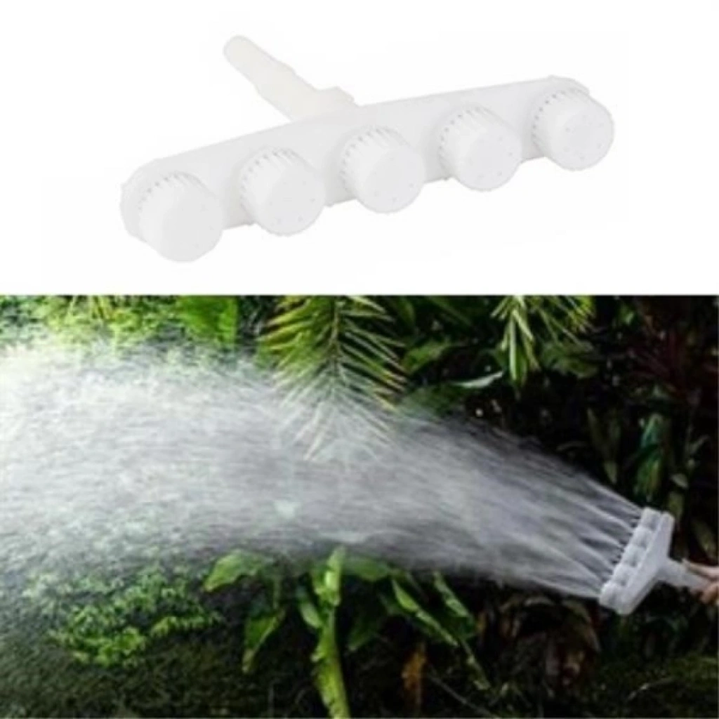 5 KAFALI SULAMA BAŞLIĞI YÜKSEK BASINÇLI HORTUM APARATIÜrün Özellikleri5 kafalı sulama başlığı yüksek basınçlı hortum aparatı, bahçe sulama işlemlerini hızlı, zahmetsiz ve verimli hale getirmek için tasarlanmıştır. Beş adet sprey çıkışına sahip yapısı sayesinde çiçek, sebze ve meyveleri tek tek sulama ihtiyacını ortadan kaldırarak geniş alanların kısa sürede sulanmasını sağlar. Yüksek basınçlı sprey sistemi, suyu eşit ve dengeli şekilde dağıtarak bitkilere zarar vermeden etkili sulama sunar. Geniş akış kapasitesi, sulama süresini kısaltarak zamandan tasarruf edilmesine yardımcı olur. Peyzaj alanları, tarım ve çim sahaları, hobi bahçeleri, parklar ve meyve sebze seralarında güvenle kullanılabilir. ABS malzemeden üretilmiş dayanıklı gövdesi, uzun süreli kullanımda formunu korur ve dış etkenlere karşı dirençlidir. Hortuma kolayca takılabilen yapısı sayesinde pratik kullanım sunar ve su miktarı ile sprey yoğunluğu ihtiyaca göre ayarlanabilir.Paket İçeriği1 adet 5 kafalı yüksek basınçlı sulama hortum aparatı