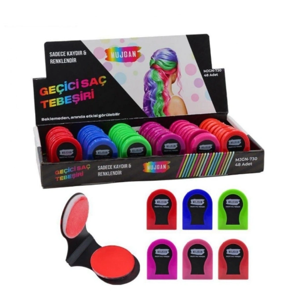 6'LI GEÇİCİ SAÇ TEBEŞİRİ SETİÜrün Özellikleri6’lı geçici saç tebeşiri seti, saç renginde hızlı ve eğlenceli değişiklikler yapmak isteyenler için pratik bir kullanım sunar. Set içerisinde yer alan farklı renk seçenekleri sayesinde saçlara tek tek ya da birlikte uygulanabilen canlı renk geçişleri elde edilebilir. Açılıp kapanabilen kompakt formu, saç tutamlarının rahatça kavranmasına yardımcı olurken kullanım sırasında kontrol sağlamayı kolaylaştırır. Saça temas eden yüzey yapısı sayesinde ürün, saç telleri üzerinde kayarak uygulanır ve saçta geçici renk etkisi oluşturur. Geçici saç renklendirme amacıyla tasarlanan bu set, farklı tarzlar denemek, özel günlerde veya etkinliklerde saç görünümüne renk katmak isteyen kullanıcılar için alternatif bir çözümdür. Renkleri tek başına kullanmak mümkün olduğu gibi birden fazla rengi birlikte uygulayarak daha dikkat çekici stiller oluşturmak da mümkündür.Ürün Teknik Özellikleri Özellik Açıklama Ürün Adı 6'lı Geçici Saç Tebeşiri Seti Set İçeriği 6 adet saç tebeşiri Kullanım Türü Geçici saç renklendirme Form Açılır kapaklı kompakt yapı Uygulama Şekli Saç tutamına sürülerek Paket İçeriği6 adet geçici saç tebeşiri