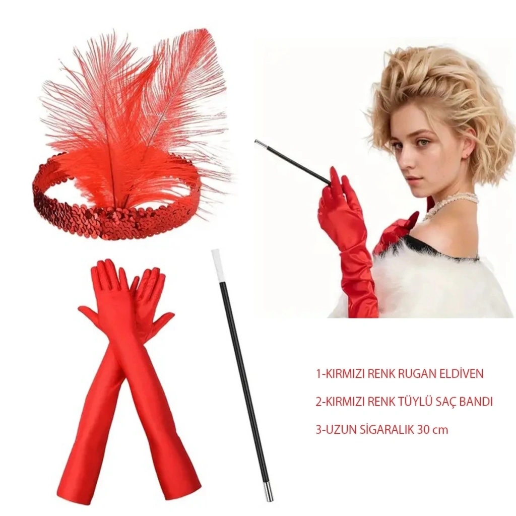 BFS 1920’ler Tarzı Kırmızı Tüylü Saç Bandı, Kırmızı Rugan Eldiven Ve Lık Seti