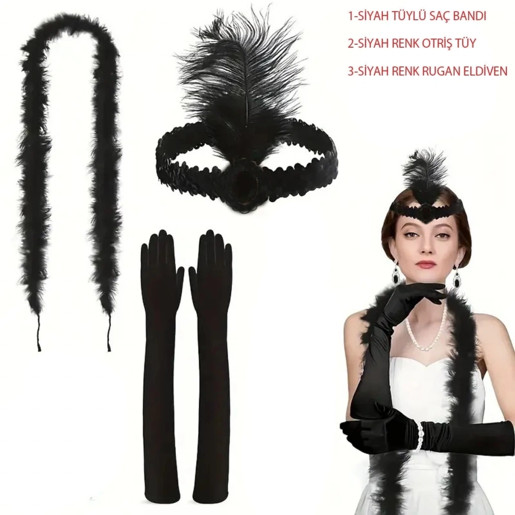 BFS 1920’ler Tarzı Siyah Tüylü Saç Bandı, Rugan Siyah Eldiven Ve Siyah Otri̇ş Seti