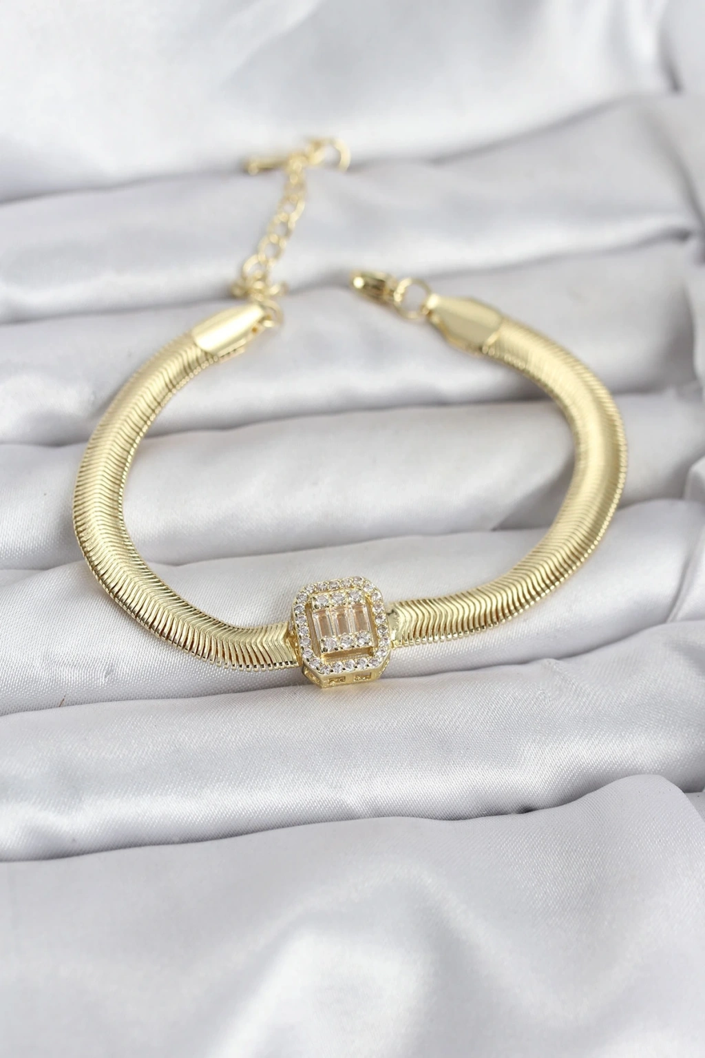 Mey İthalat® 316L Çelik Gold Renk Baget Zirkon Taşlı Yılan Zincirli Kadın Bileklik