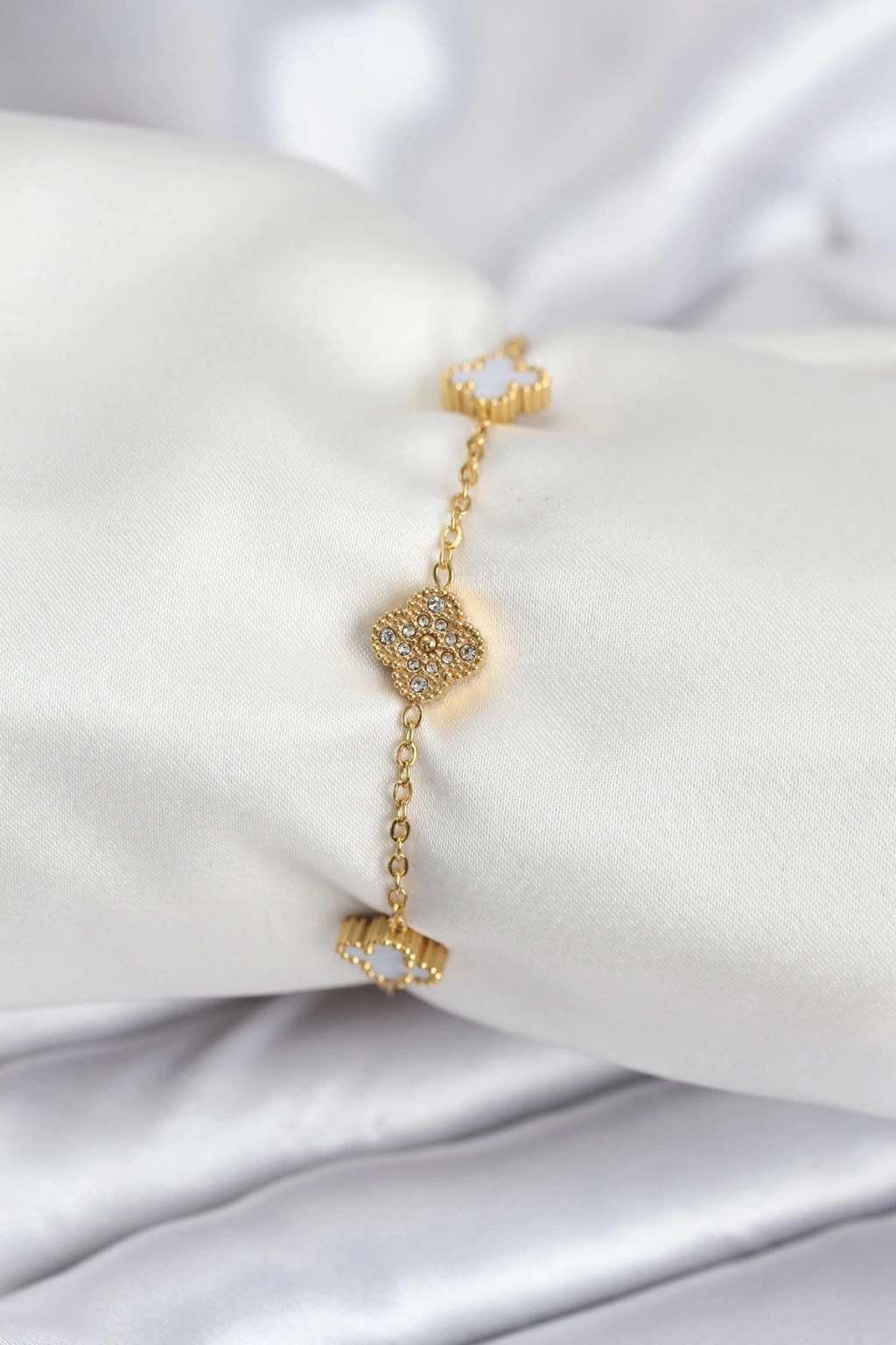 BFS 316L Çelik Gold Renk Beyaz ve Zirkon Taşlı Baby Boy Yonca Kadın Bileklik