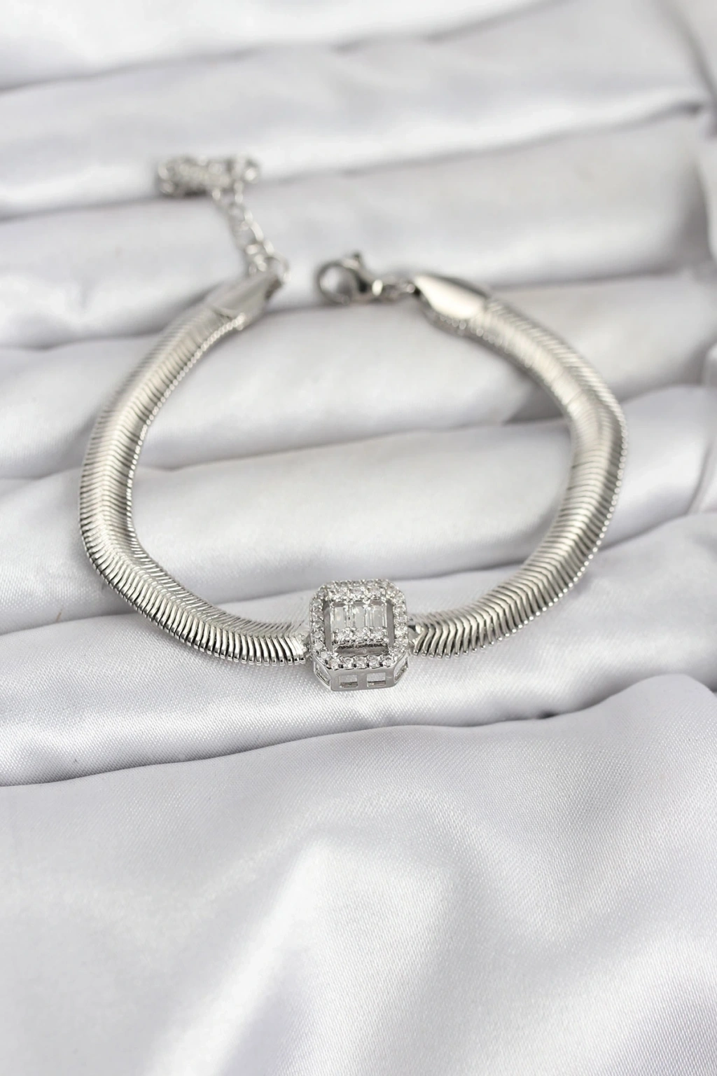 Mey İthalat® 316L Çelik Gümüş Renk Baget Zirkon Taşlı Yılan Zincirli Kadın Bileklik