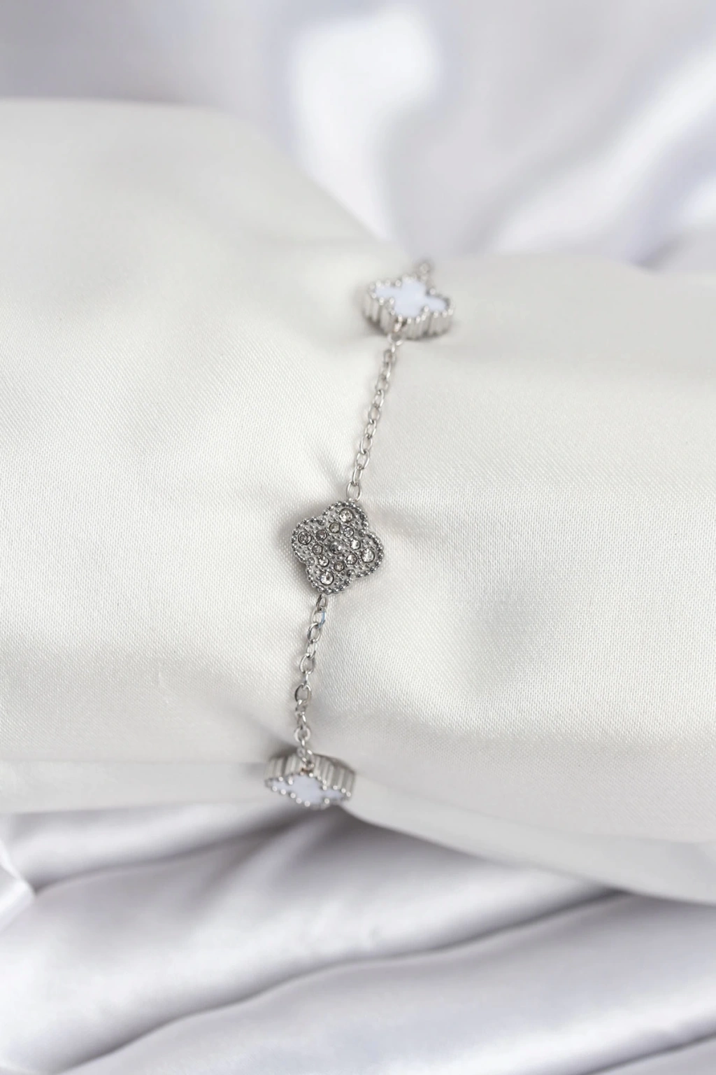 BFS 316L Çelik Gümüş Renk Beyaz ve Zirkon Taşlı Baby Boy Yonca Kadın Bileklik