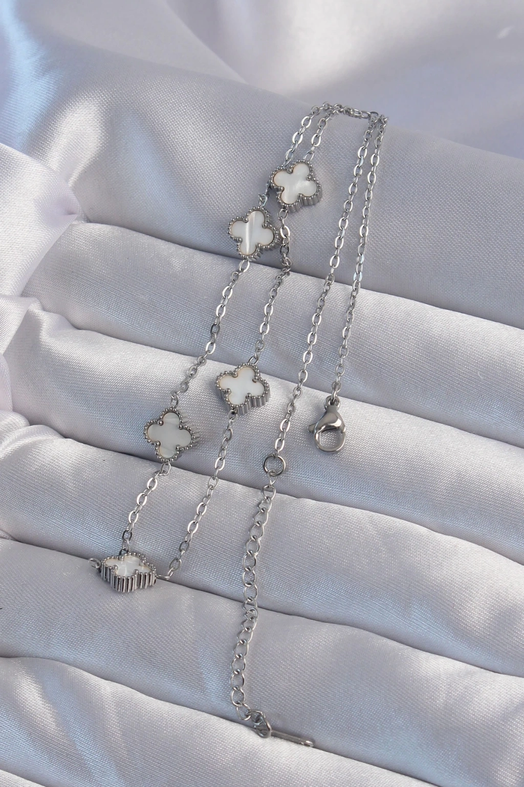 BFS 316L Çelik Gümüş Renk Minimal Beyaz Sedefli Yonca Kolye