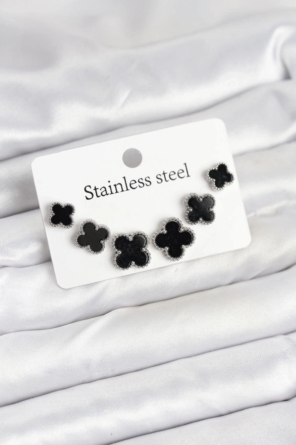 BFS 316L Çelik Gümüş Siyah Renk 3 Boy Yonca Küpe Seti