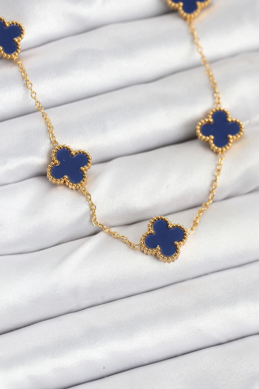 BFS 316L Çelik Zincir Gold Renk Lacivert Yonca Kadın Kolye