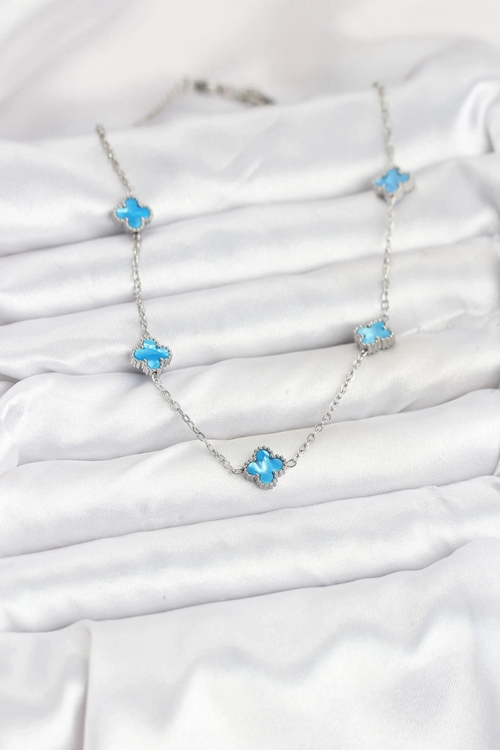 BFS 316L Çelik Zincir Gümüş Renk Buz Mavisi Baby Boy Yonca Kadın Kolye