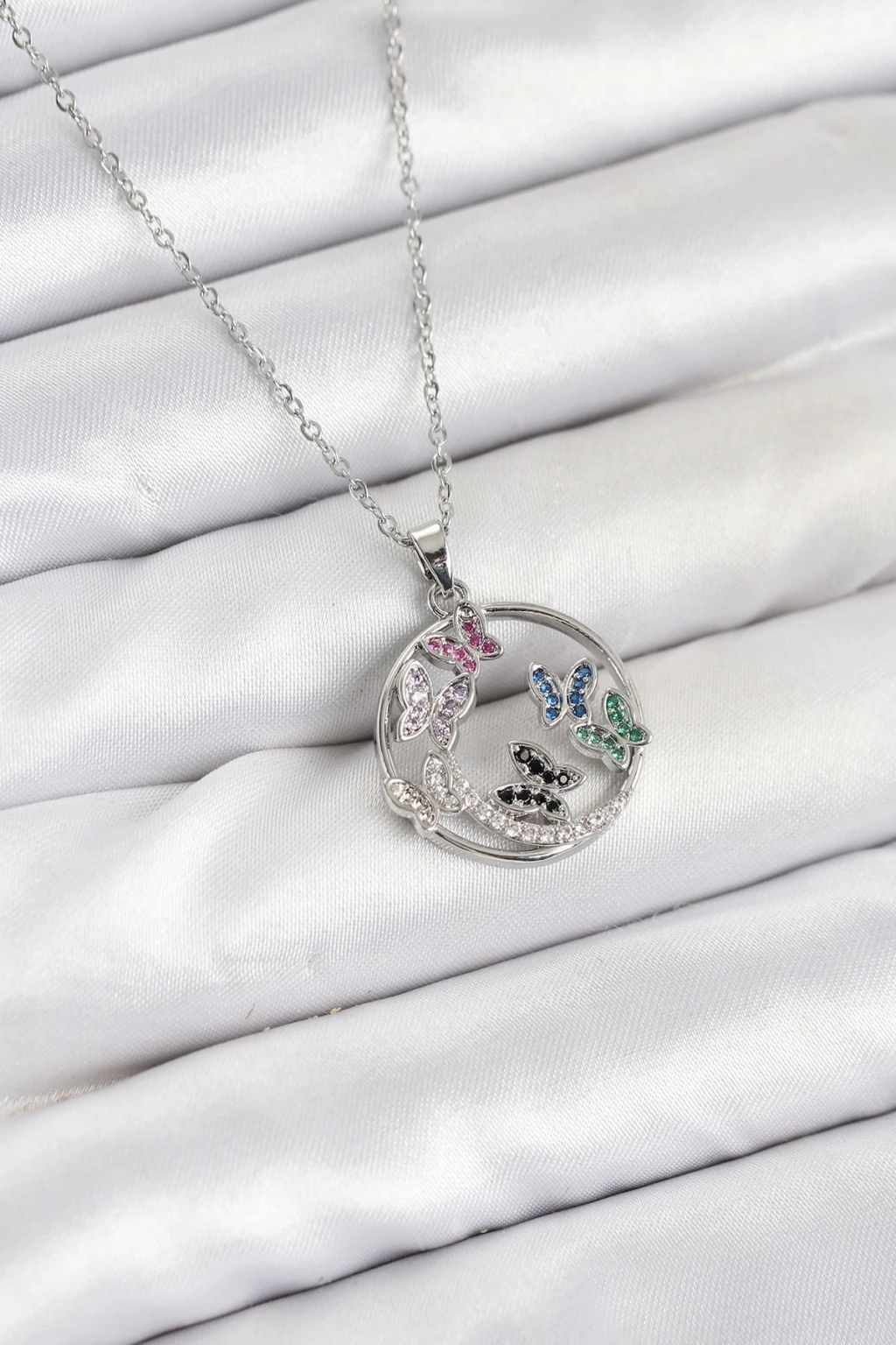 BFS 316L Çelik Zincir Gümüş Renk Zirkon Taşlı Kelebekli Kadın Kolye