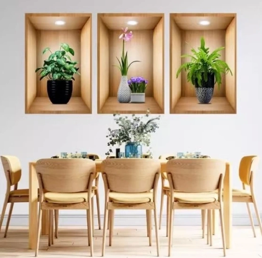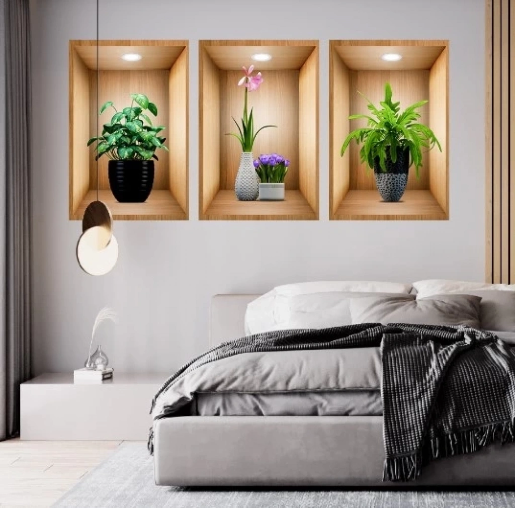 BFS 3D Çiçek Vazo Duvar Sticker 3 lü Set Kahverengi Fon