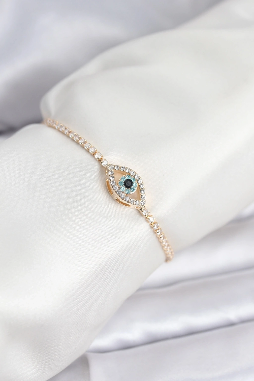 Mey İthalat® Göz Model Zirkon Taşlı Gold Renk Asansörlü Su Yolu Bileklik