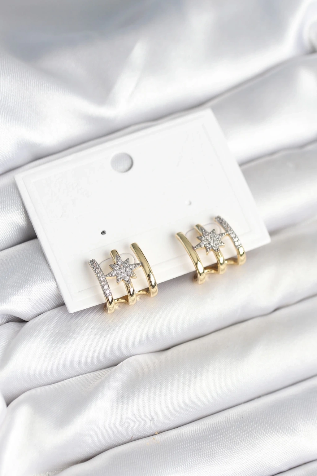 BFS 316L Çelik Gold Renk Zirkon Taşlı Yıldız Model Kadın Küpe Seti