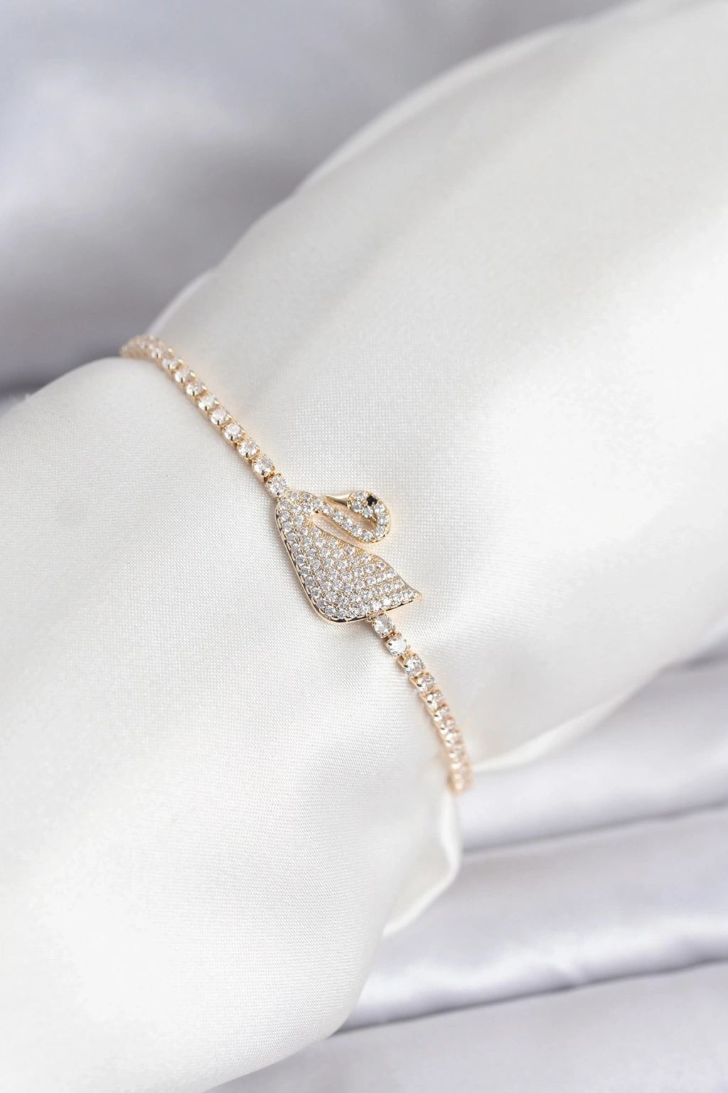 Mey İthalat® Kuğu Model Zirkon Taşlı Gold Renk Asansörlü Su Yolu Bileklik