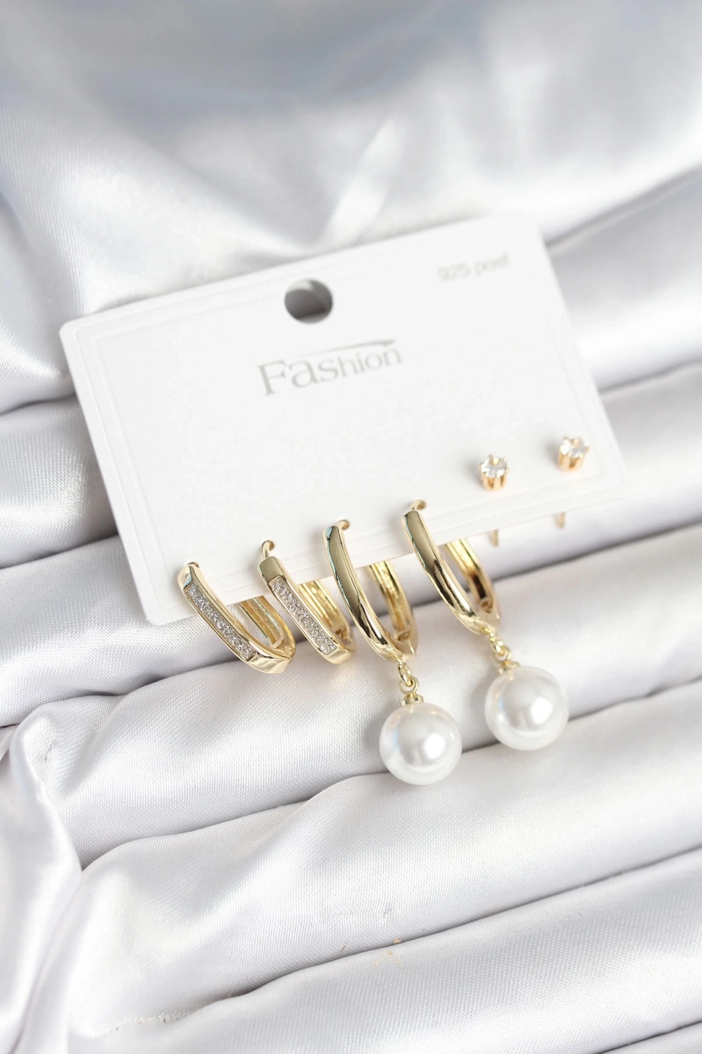 BFS Pirinç Gold Renk İnci Detaylı 925 Ayar Gümüş Çivili Kadın Küpe Seti