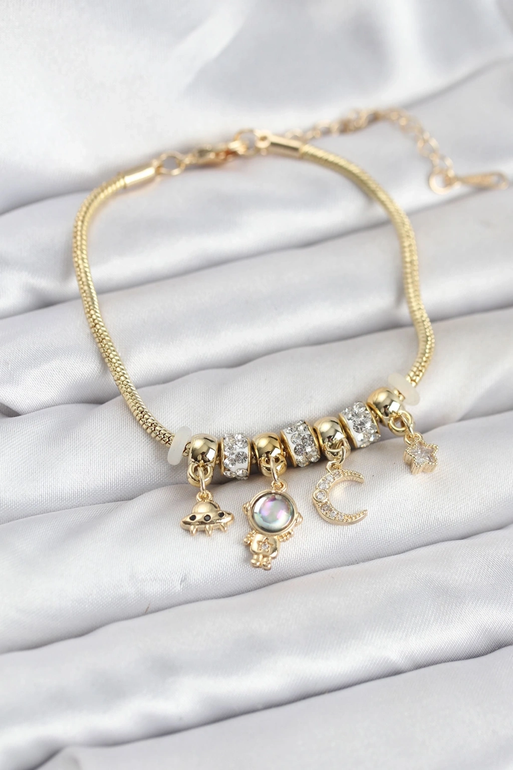 Mey İthalat® Pirinç Gold Renk Uzay Tema Charmlı Kadın Bileklik