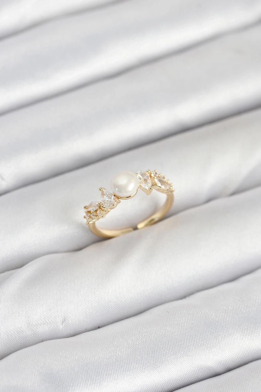BFS Pirinç İnci Detaylı Papatya Figürlü Zirkon Taşlı Gold Renk Ayarlanabilir Kadın Yüzük