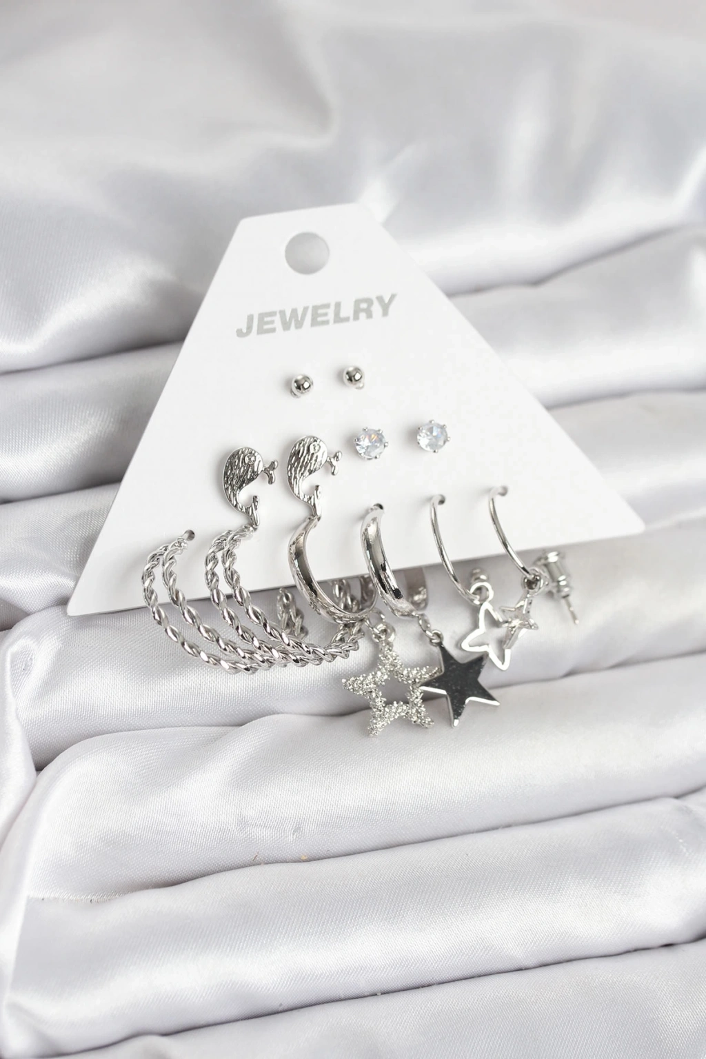 BFS Gümüş Renk Pirinç 6 Çift Kadın Küpe Seti