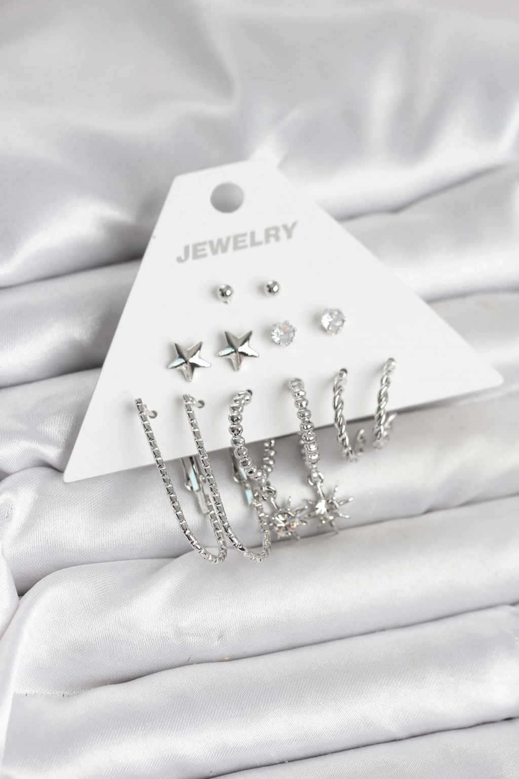 BFS Gümüş Renk Pirinç 6 Çift Kadın Küpe Seti