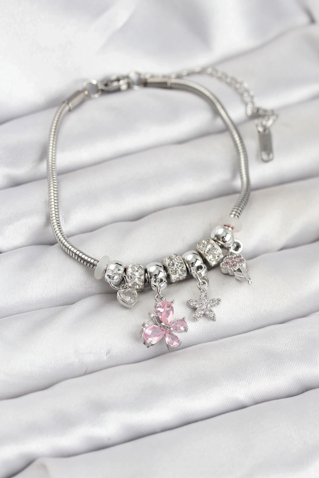 Mey İthalat® Pirinç Gümüş Renk Pembe Kelebek Charmlı Kadın Bileklik