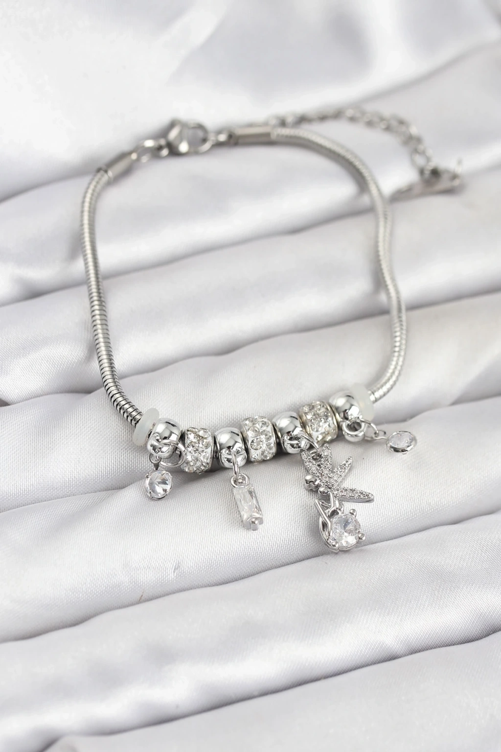 Mey İthalat® Pirinç Gümüş Renk Tinkerbell Charmlı Kadın Bileklik