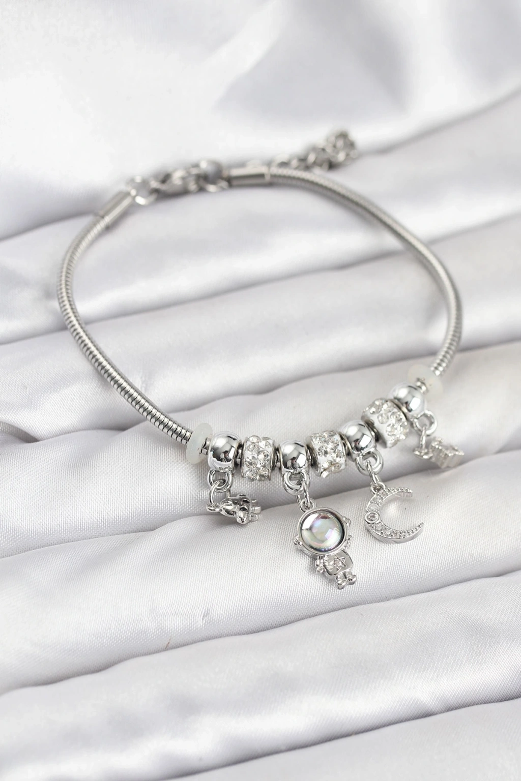 Mey İthalat® Pirinç Gümüş Renk Uzay Tema Charmlı Kadın Bileklik