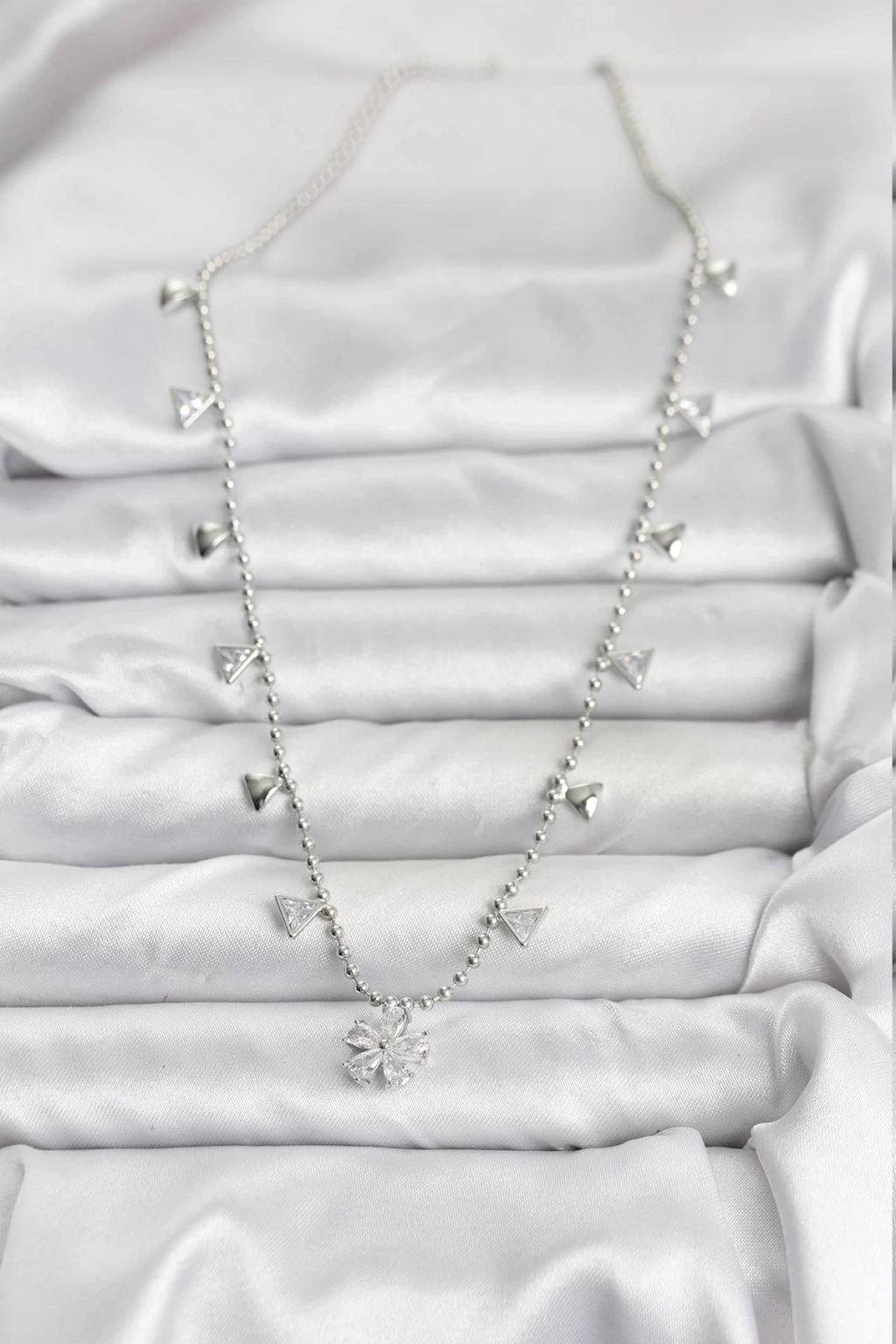 BFS Pirinç Gümüş Renk Zirkon Taşlı Çiçek Model Kadın Kolye