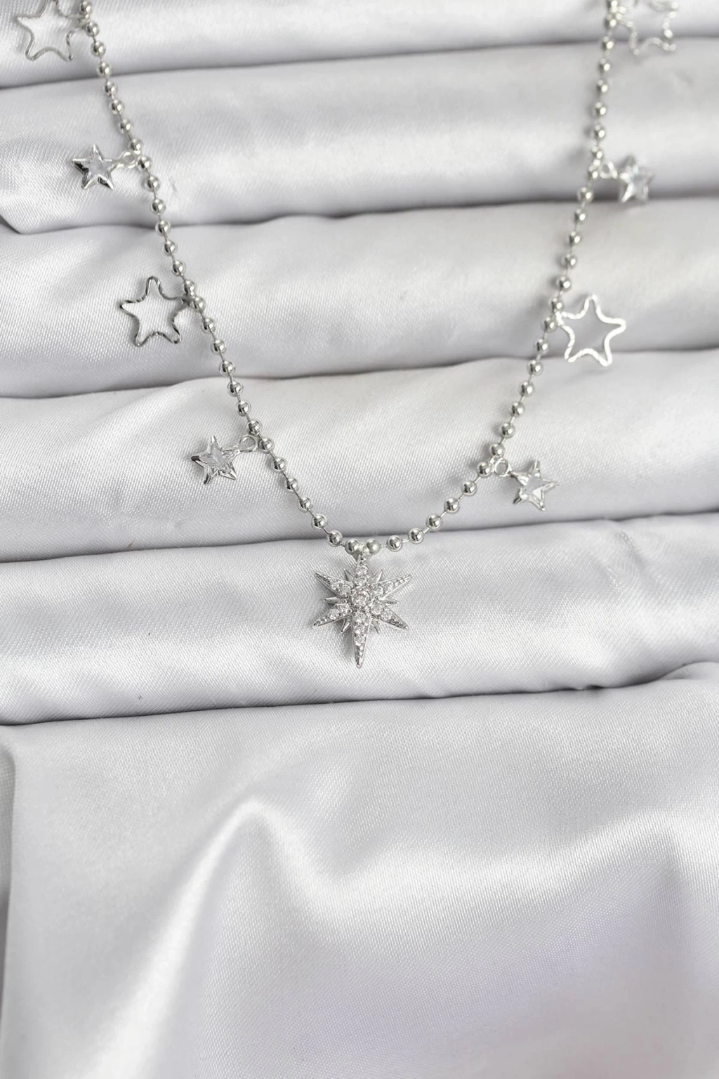 BFS Pirinç Gümüş Renk Zirkon Taşlı Kutup Yıldızı Model Kadın Kolye