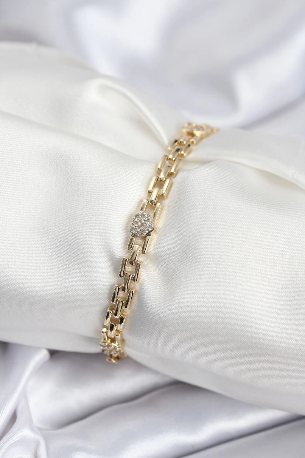 BFS Pirinç VIP Seri Gold Renk Zincir Model Kalpli Zirkon Taşlı Kadın Bileklik