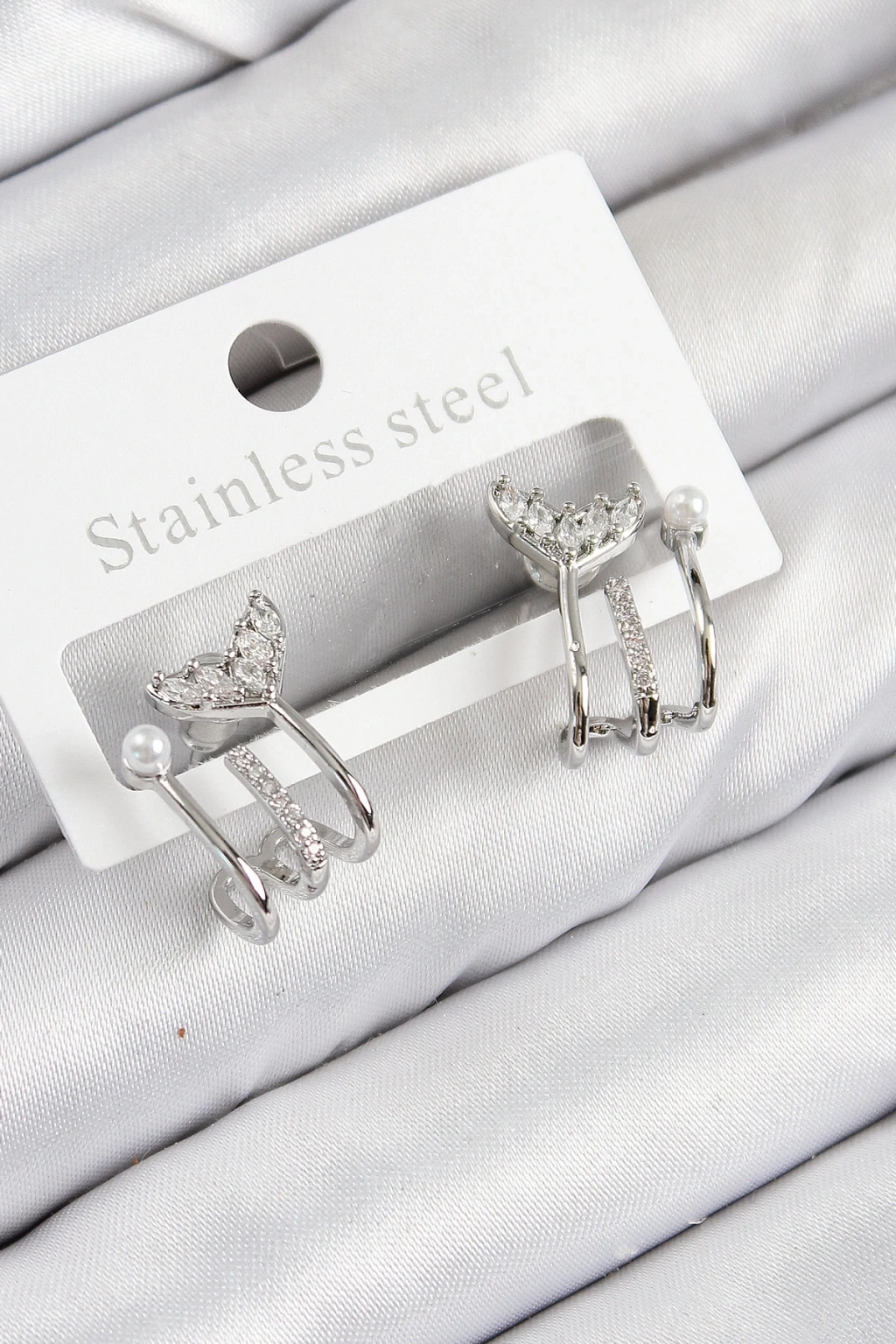 BFS Pirinç Zirkon Taşlı İnci Detaylı Balık Kuyruğu Model Gümüş Renk Kadın Küpe