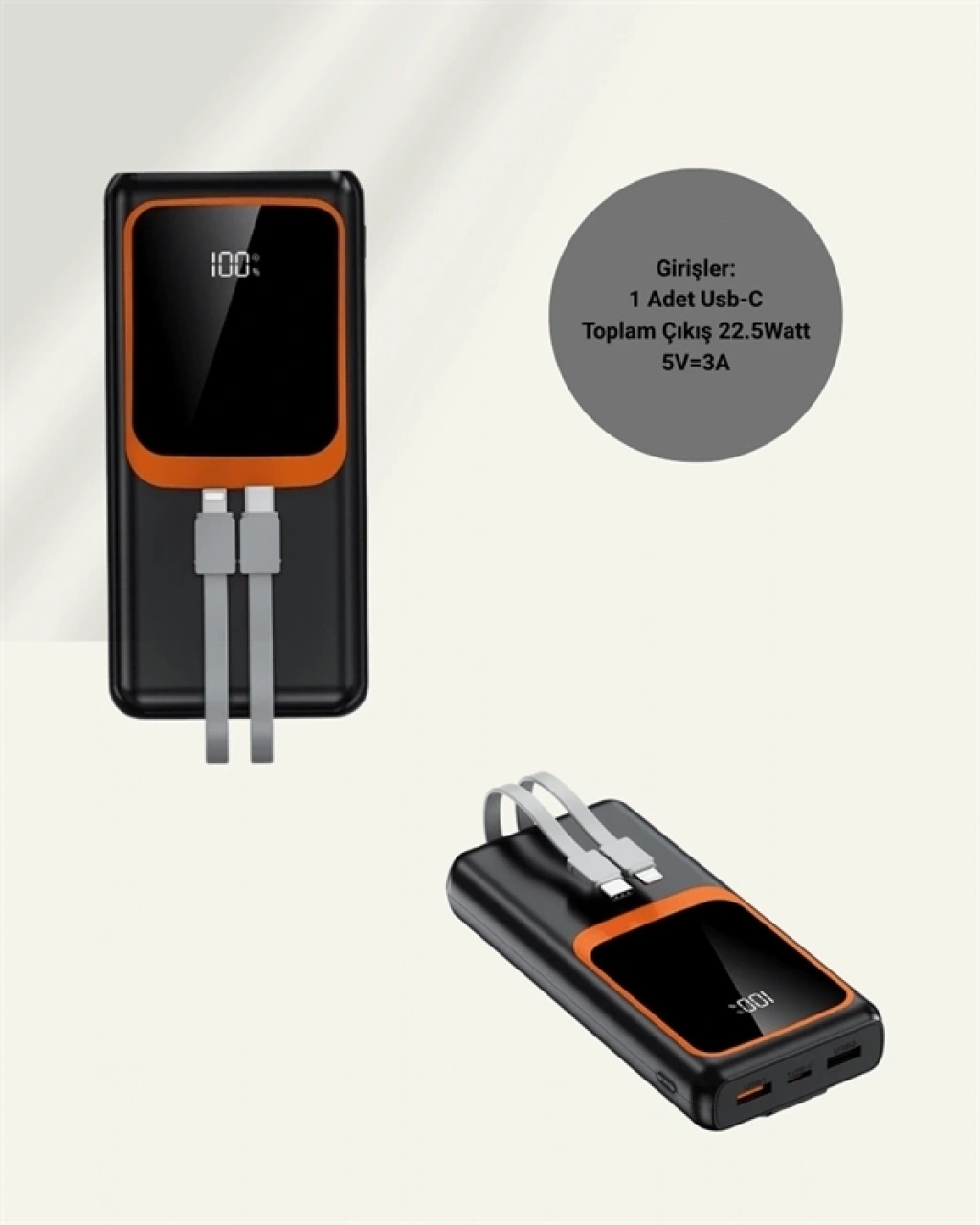 BFS Powerbank 20000 mAh | 22.5W Hızlı Şarj, Dahili Kablolu, LCD Ekranlı Şarj Cihazı