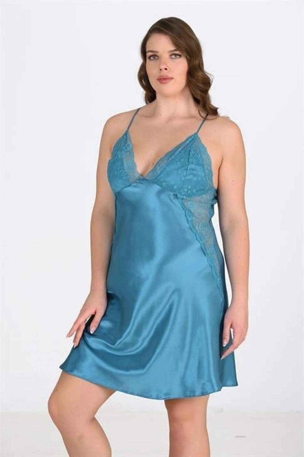 Büyük Beden Dantel İşlemeli Petrol Mavisi Saten Gecelik