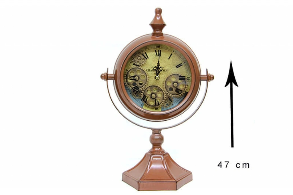 Çarklı Masa SaatiÜrün ÖzellikleriMasa Saati Roma Rakamlı Köstek modelidir.Tamamı metal malzemeden üretilmiştir.İç bölümünde ki çarklar hareket etmektedir.Akar mekanizma kullanılmıştır, sessizdir.3 adet pil ile çalışır.Ürün Ebatları Çap : 25 cm Genişlik : 12 cm Yükseklik : 47 cmAğırlık : 1,10 kg