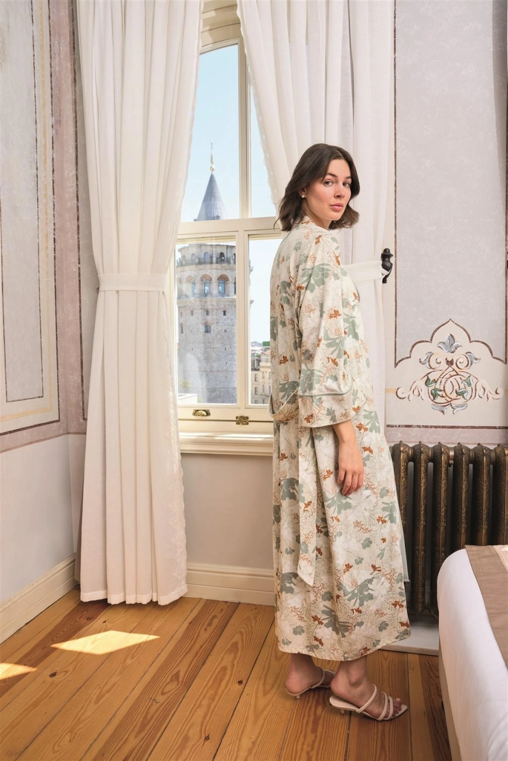 Sabahlık: Ekru zemin üzerine çiçek yaprak desenlidir, kuşaklıdır, örme kumaştır.