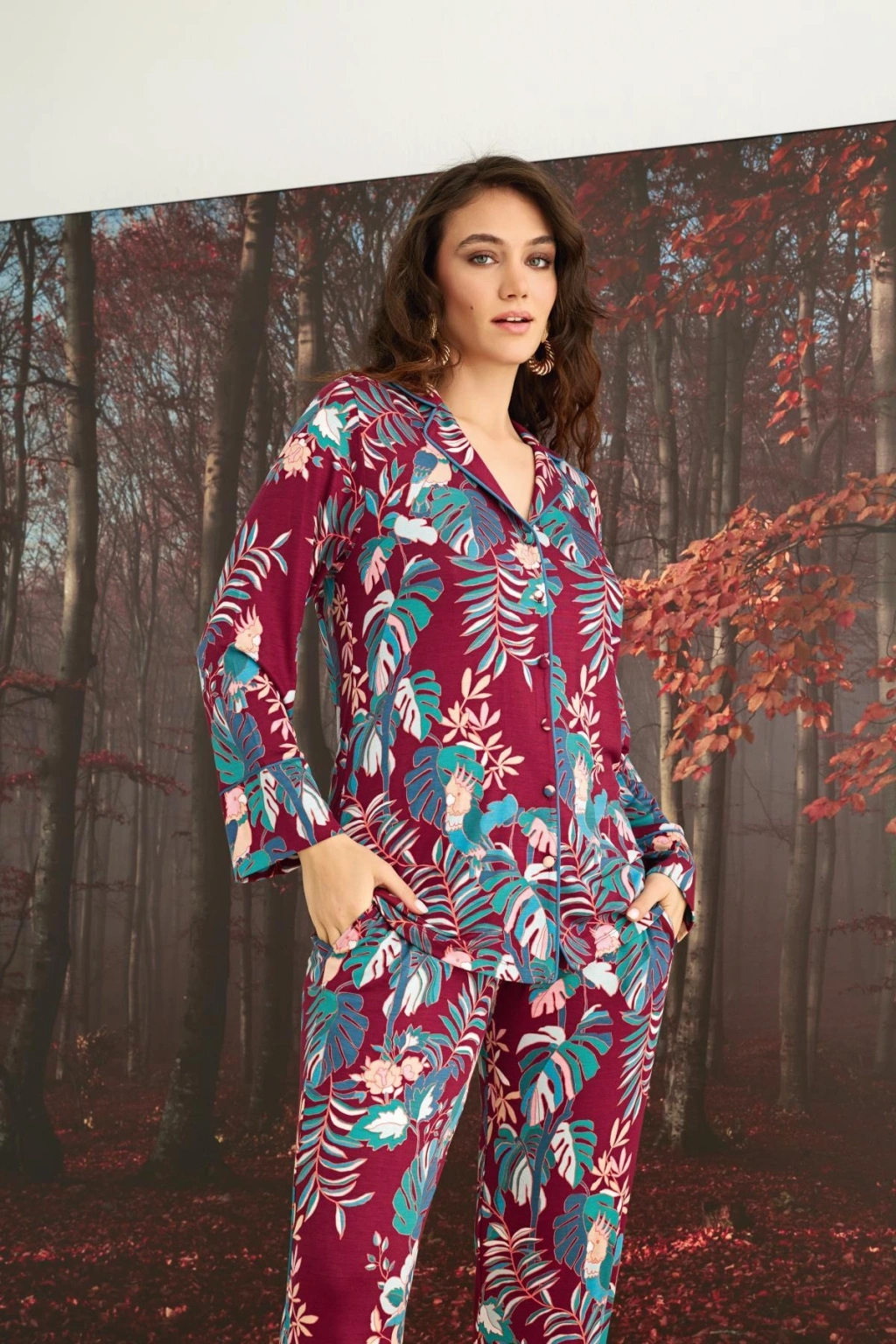 Üst: Bordo zemin üzerine çiçek ve yaprak desenlidir, gömlek yakalıdır, önü boydan düğmelidir, uzun kolludur, örme kumaştır.