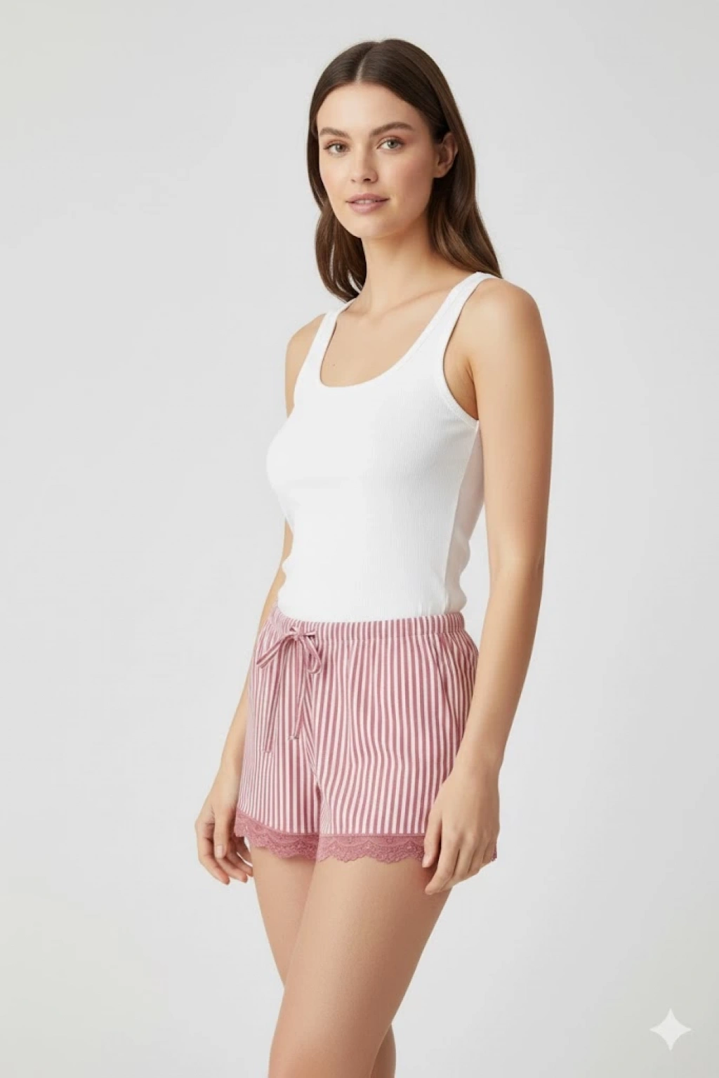 Çizgili Penye Kadın Ev Şortu Bacak Dantel Detaylı Ev Giyim Fuşya