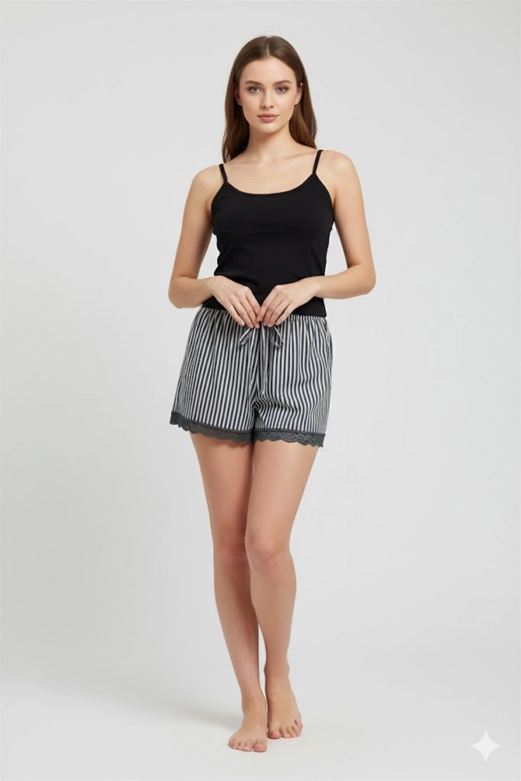 Çizgili Penye Kadın Ev Şortu Bacak Dantel Detaylı Ev Giyim Siyah