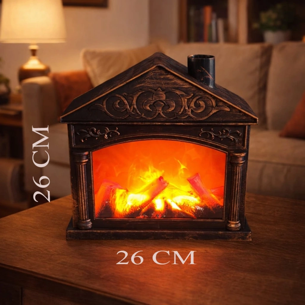 DEKORATİF EV TASARIMLI LED ŞÖMİNE IŞIKÜrün ÖzellikleriEvinize gerçek bir dağ evi sıcaklığını ve şömine huzurunu taşıyın! Dekoratif Ev Tasarımlı LED Şömine Işık, benzersiz çatı mimarisi ve estetik oymalarıyla dikkat çeken dev bir dekorasyon objesidir. 26 cm x 26 cm boyutlarındaki kare formuyla geniş bir görüş alanı sunan bu özel parça, yüksek kaliteli dayanıklı plastik malzemeden üretilmiştir. İç kısmında yer alan hareketli LED mekanizması, odunların köz halindeki yanma efektini son derece gerçekçi bir şekilde yansıtarak karanlıkta büyüleyici bir görsellik sunar. Çift enerji seçeneği sunan bu model, USB kablosu ile kesintisiz çalışabildiği gibi 4 adet AAA pil ile kablosuz olarak da kullanılabilir. TV ünitesi üzerinde, şömine rafında veya salonunuzun her köşesinde odak noktası olacak bu ürün, hem kış dekorasyonunuzu tamamlayacak hem de sevdikleriniz için prestijli ve unutulmaz bir hediye olacaktır.Ürün Teknik ÖzellikleriÖzellikAçıklamaBoyutlar26 cm x 26 cm (Kare Dev Boy)MalzemeYüksek Kaliteli ve Dayanıklı Sert PlastikIşık KaynağıHareketli Alev / Odun Yanma Efektli LEDGüç KaynağıUSB Kablo veya 4 Adet AAA Pil (Piller dahil değildir)TasarımÇatılı Ev Formu ve Dekoratif Oymalı DetaylarKullanım AlanıEv Dekorasyonu, Gece Lambası, Kış Bahçesi, HediyeEk ÖzellikÇift Güç Girişi ile Esnek KullanımPaket İçeriği1 Adet Dekoratif Ev Tasarımlı LED Şömine Işık