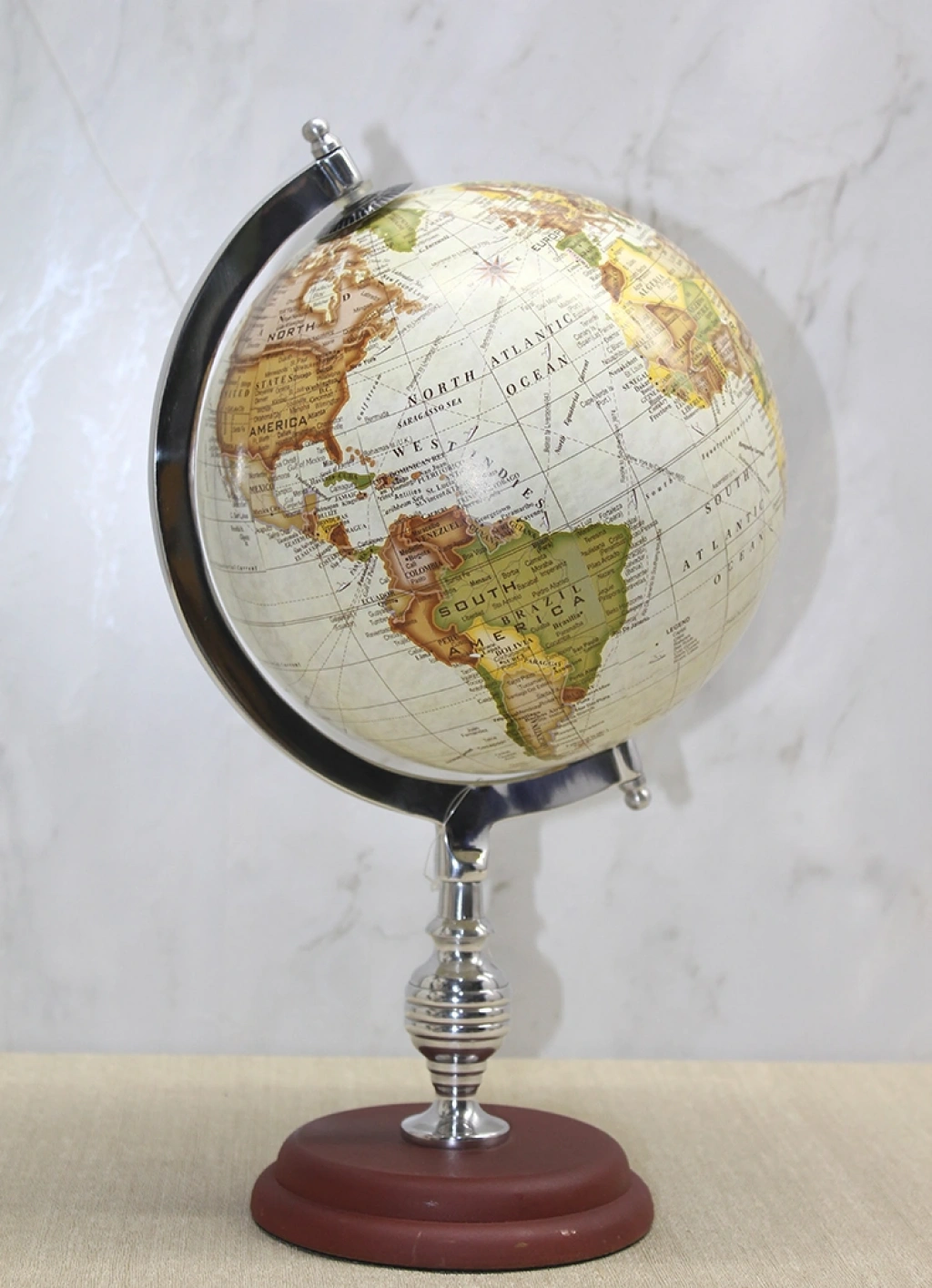 DEKORATİF MASAÜSTÜ DÜNYA KÜRE - MODEL 12Ürün ÖzellikleriDekoratif Masaüstü Dünya Küre - Model 12, açık krem tonlu atlas yüzeyi ve klasik kırmızımsı ahşap görünümlü kaidesi ile zamansız bir dekor anlayışı sunar. 38x21 cm ölçüsü sayesinde masa üzerinde dengeli bir yükseklik oluşturur ve bulunduğu alanda güçlü bir görsel odak noktası haline gelir. Açık tonlu okyanus zemin üzerinde yer alan sarı ve kahverengi kıta detayları, klasik atlas estetiğini daha yumuşak ve ferah bir renk geçişi ile yansıtır. Metal meridyen halkası ve sağlam stand yapısı ürüne hem estetik hem de dengeli bir duruş kazandırır. büyük boy masaüstü dünya küre arayanlar için ideal ölçüde olan bu model, yönetici masası, çalışma odası, kitaplık ya da ofis konsolu üzerinde prestijli bir tamamlayıcı olarak kullanılabilir. Hem klasik hem modern dekorasyonla uyum sağlayan dekoratif atlas dünya küresi, entelektüel bir atmosfer oluşturmak isteyenler için şık ve karakterli bir seçimdir.Ürün Teknik ÖzellikleriÖzellikAçıklamaÜrün AdıDekoratif Masaüstü Dünya Küre - Model 12Boyut38 x 21 cmKullanım TürüMasaüstüTasarımAçık Krem Tonlu AtlasKullanım AlanıEv, Ofis, Çalışma OdasıPaket İçeriği1 Adet Dekoratif Masaüstü Dünya Küre - Model 12