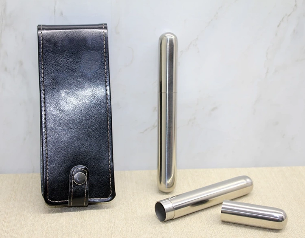 DERİ KILIFLI İKİLİ PASLANMAZ ÇELİK PURO TÜPÜÜrün ÖzellikleriDeri kılıflı ikili paslanmaz çelik puro tüpü, puro severler için şık ve pratik bir üründür. İki puroyu güvenli bir şekilde taşımanızı sağlar. Paslanmaz çelik malzeme ile dayanıklıdır, uzun ömürlü kullanım sunar. Deri kılıfı, hem estetik hem de taşıma kolaylığı sağlar. Bu puro tüpü, şık tasarımı ile hem işlevsel hem de dekoratif bir aksesuardır. Puroyu nemden, tozdan ve hasardan korur. Taşıması oldukça kolay ve pratik olan bu ürün, puro meraklılarının vazgeçilmezi olacaktır.Paket İçeriği1 Adet Deri Kılıflı İkili Paslanmaz Çelik Puro Tüpü