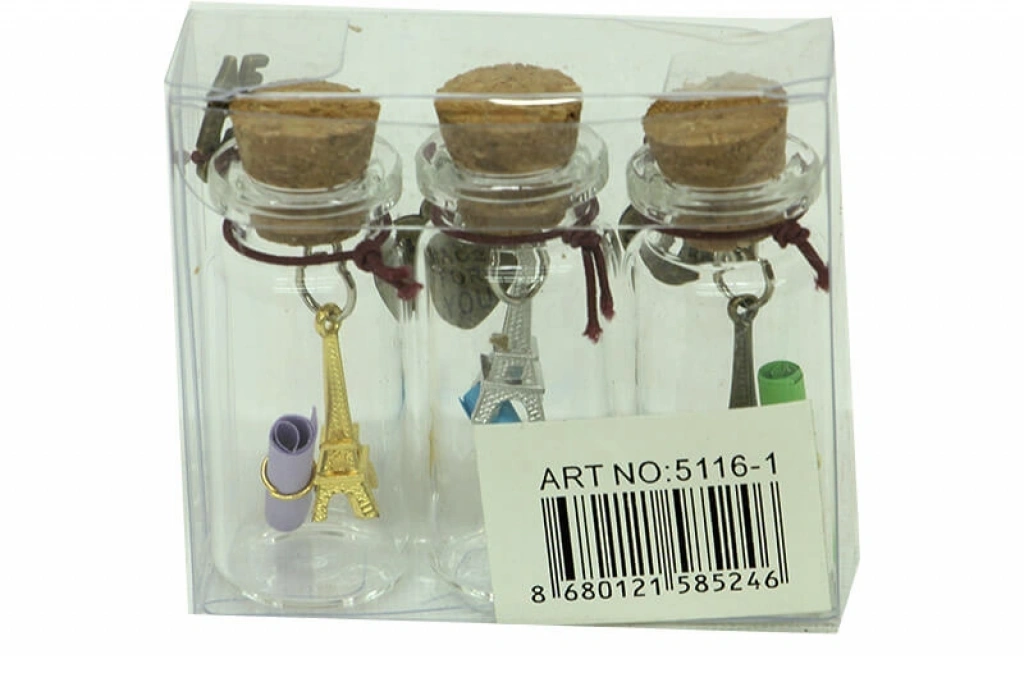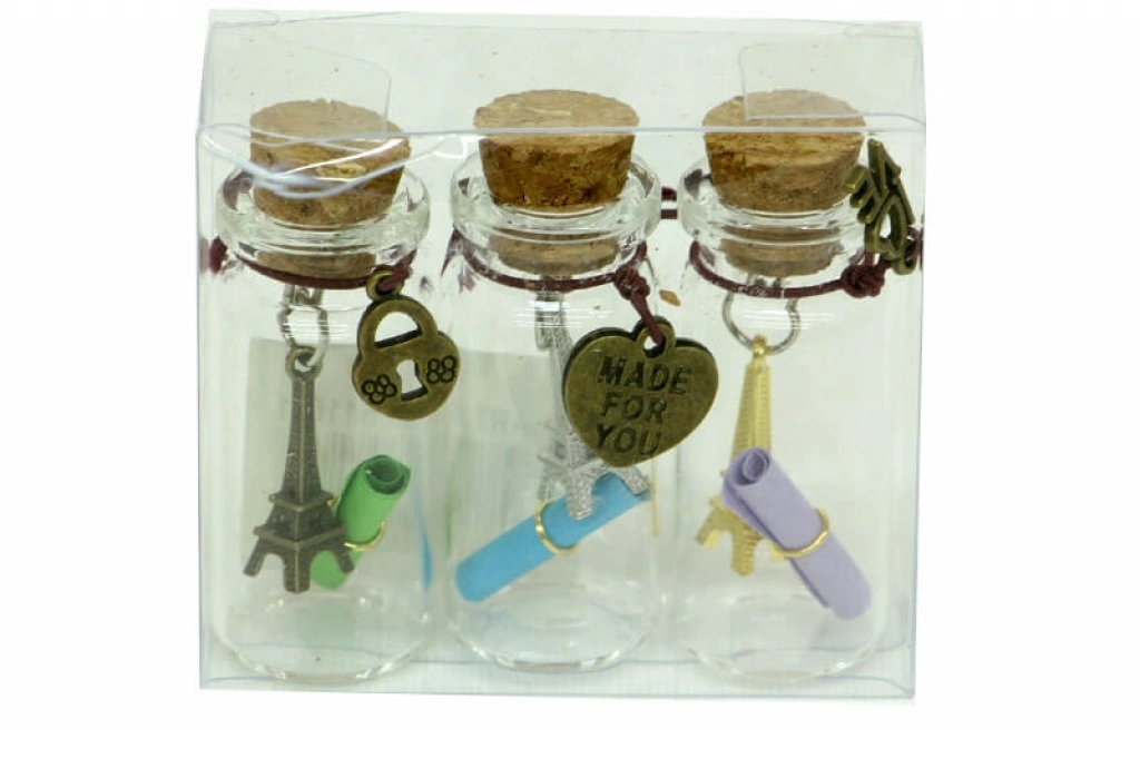 DİLEK ŞİŞESİ Ürün Özellikleri Dilek Şişesi modelidir. Tamamı cam malzemedenüretilmiştir. 1 pakette 3 adet mevcuttur. ÜrünEbatları Çap: 2 cm Yükseklik: 5,3 cm Paket İçeriği 1 Adet Dilek Şişesi