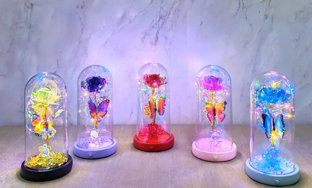 IŞIKLI MÜZİKLİ ROMANTİK KELEBEKLİ FANUS İÇİNDE GÜLÜrün ÖzellikleriIşıklı müzikli romantik kelebekli fanus içinde gül, zarif detayları ve etkileyici ışık gösterisiyle dekorasyona romantik bir atmosfer kazandıran özel bir hediyelik üründür. Şeffaf fanus tasarımı içerisinde yer alan yapay gül ve kelebek figürü, LED ışık sistemi sayesinde çalıştırıldığında yumuşak ve göz alıcı bir aydınlatma sunar. Müzikli yapısı ile görsel etkiyi hoş bir melodiyle tamamlayan bu model, bulunduğu ortamda dikkat çekici ve duygusal bir ambiyans oluşturur. 21x11 cm ölçüsü sayesinde masa, komodin, raf ve vitrin üzerinde rahatlıkla sergilenebilir ve dekoratif duruşuyla öne çıkar. Renk seçimi bulunmayan ürün, görsellerde yer alan renklerden biri olacak şekilde karışık olarak gönderilmektedir. Sevgililer günü, doğum günü, yıl dönümü ve özel günler için anlamlı bir hediye alternatifi sunan bu fanus, romantik ve şık tasarımıyla her yaş grubuna hitap eder.Paket İçeriği1 adet Işıklı Müzikli Romantik Kelebekli Fanus İçinde Gül