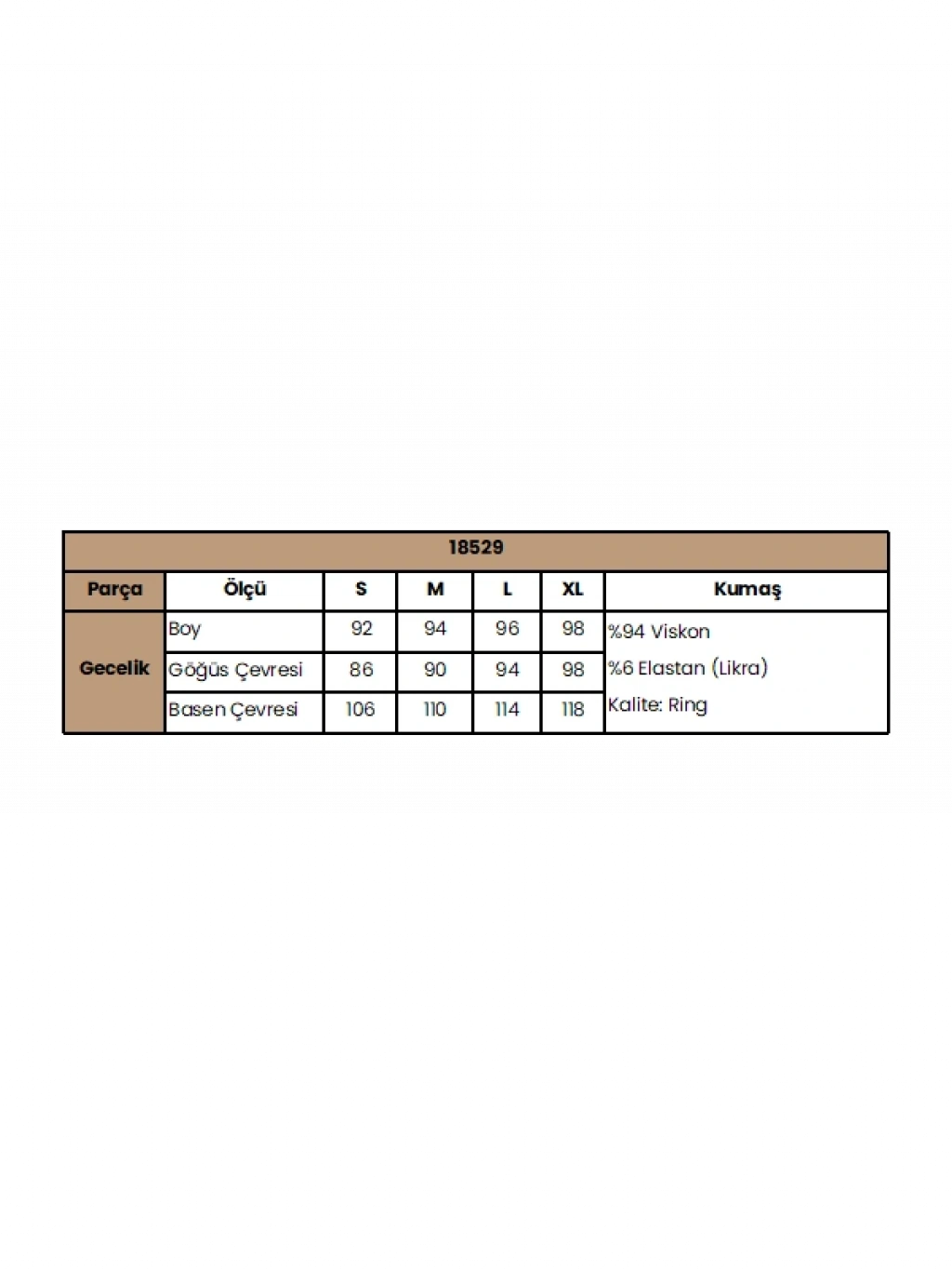 Gecelik: Haki renklidir, V yakalıdır, kısa kolludur, kolu ve omzu göğüs hizasına kadar dantellidir, yakasının altı düğmelidir, örme kumaştır.Materyal%94 Viskon %6 Elastan