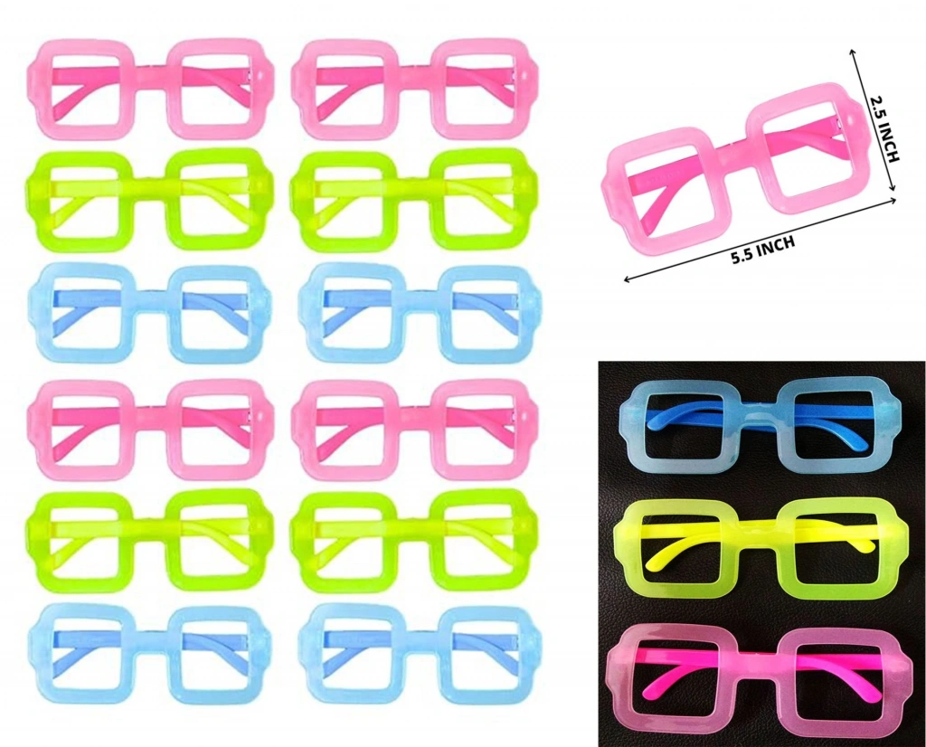 Mey İthalat® Fosforlu Kare Model Glow Parti Gözlüğü Karanlıkta Yanan Gözlükler 12 Adet