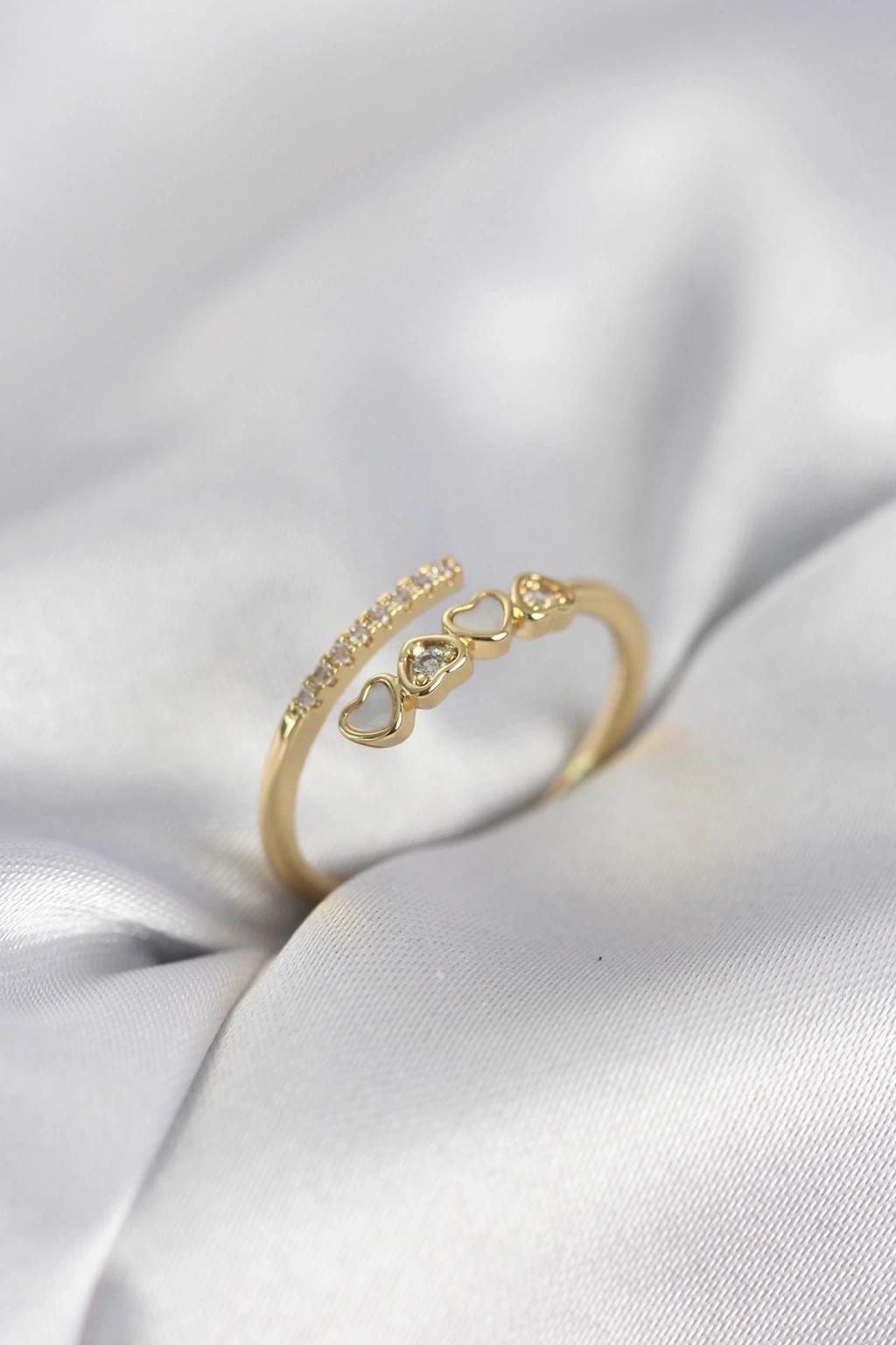 Mey İthalat® Pirinç Gold Renk Zirkon Taşlı Kalpli Model Ayarlanabilir Yüzük