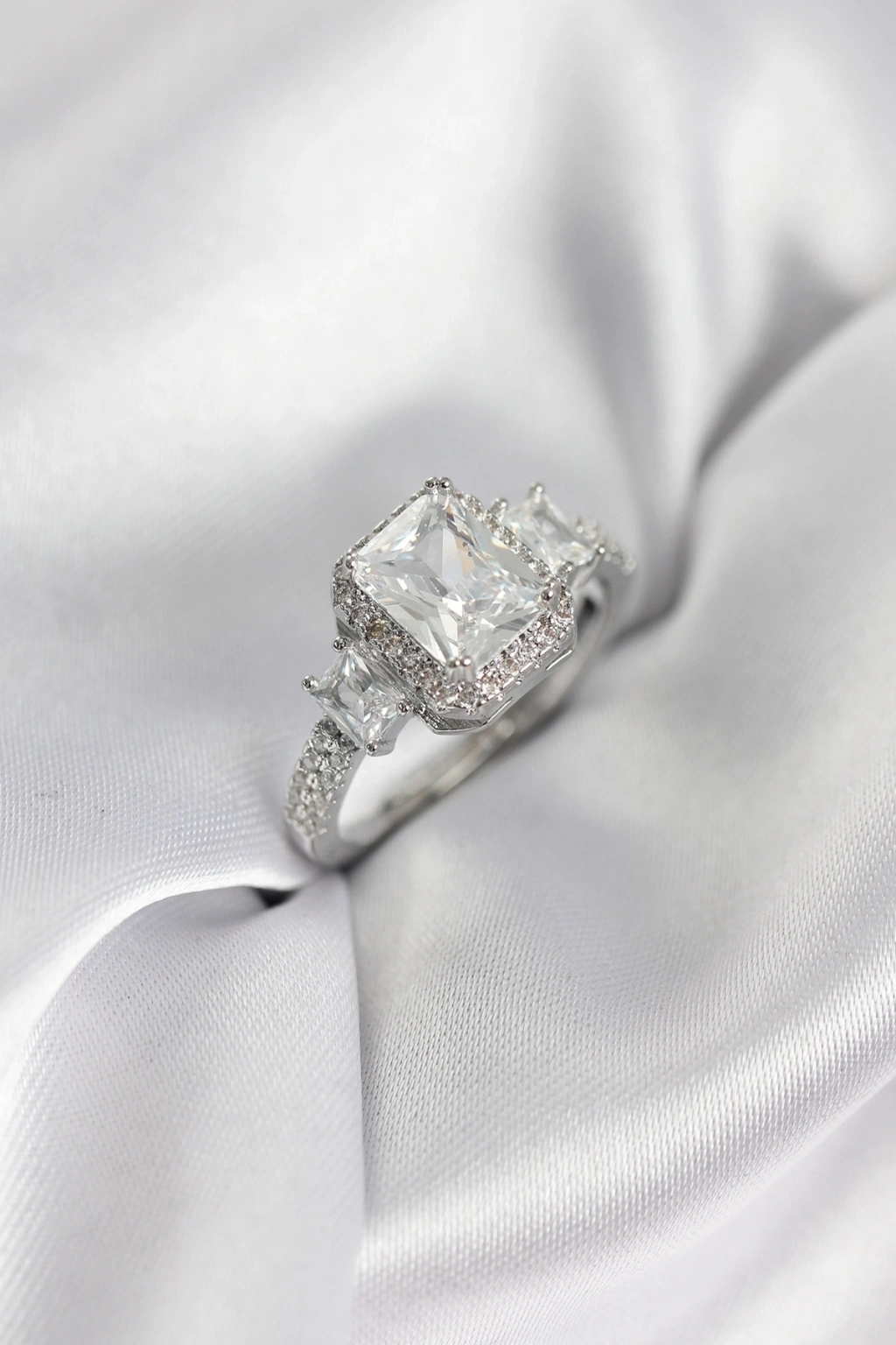 Mey İthalat® Gümüş Renk Kare Baget Zirkon Taşlı Tek Taş Model Kadın Yüzük