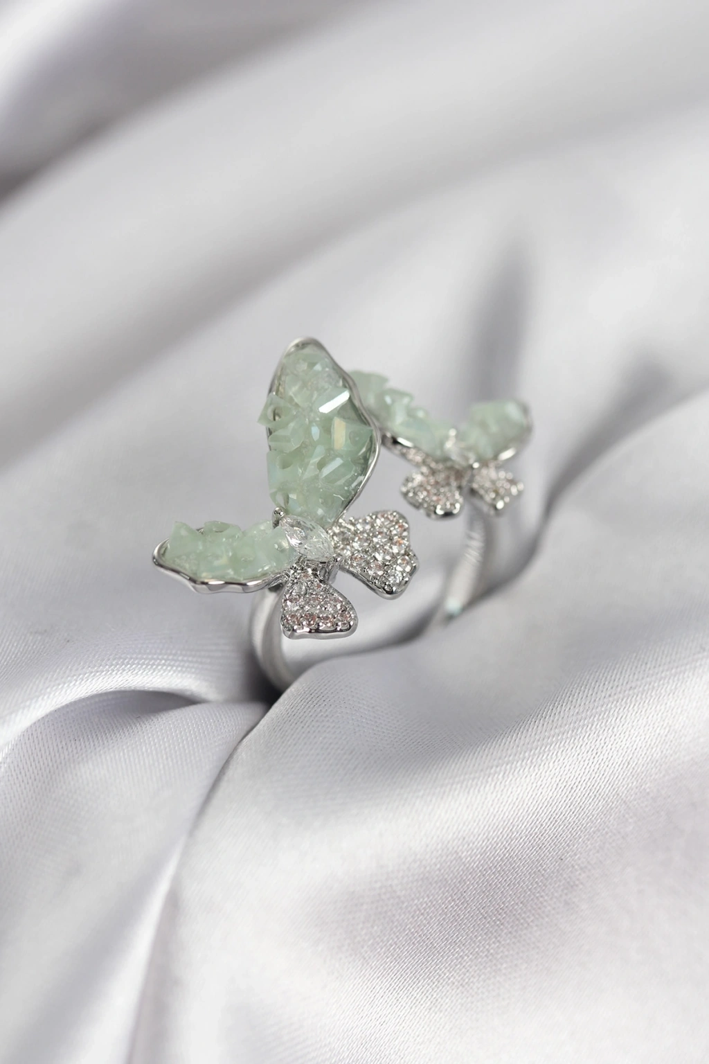 Mey İthalat® Gümüş Renk Su Yeşili Kelebek Model Zirkon Taşlı Kadın Yüzük