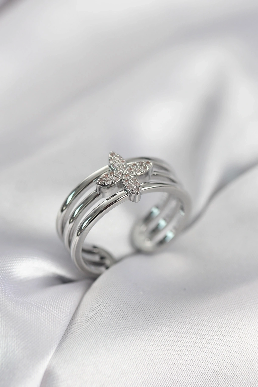 Mey İthalat® Pirinç Gümüş Renk Zirkon Taş Detay Kelebek Model Kadın Yüzük