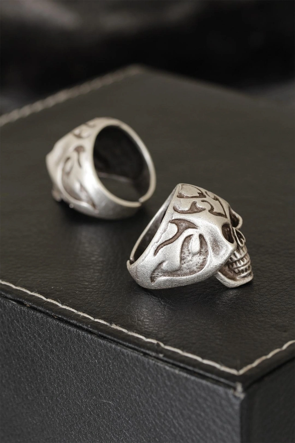 Mey İthalat® Kuru Kafa Tasarımlı Eskitme Gümüş Desenli Ayarlamalı Model Erkek Yüzük